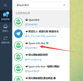 1、电报里面搜索框搜索“@SpamBot”,一定是红色箭头指向的那个,这个是官方专门用来处理这些事情的机器人。